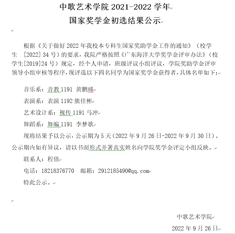 威尼斯人娱乐城 2021-2022学年国家奖学金初选结果公示