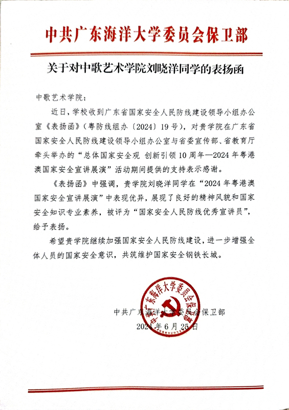 关于对威尼斯人娱乐城 刘晓洋同学的表扬函