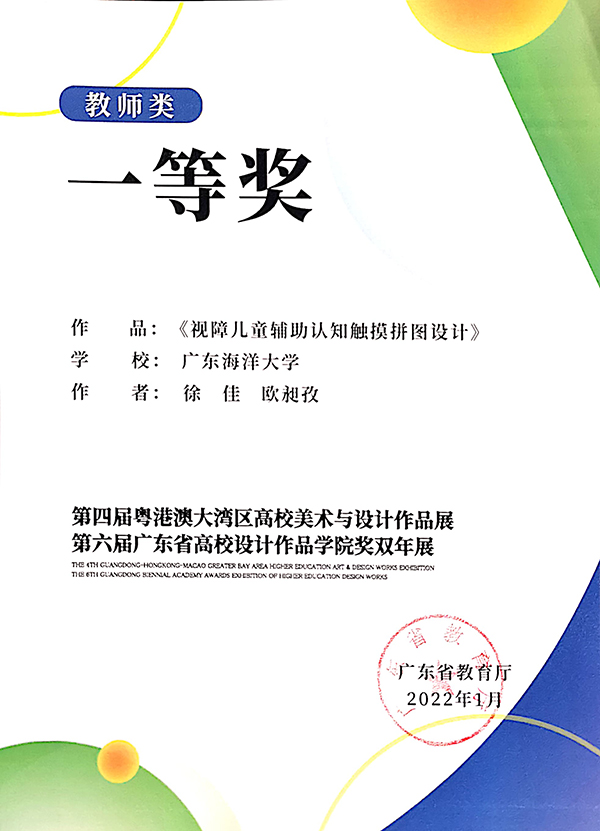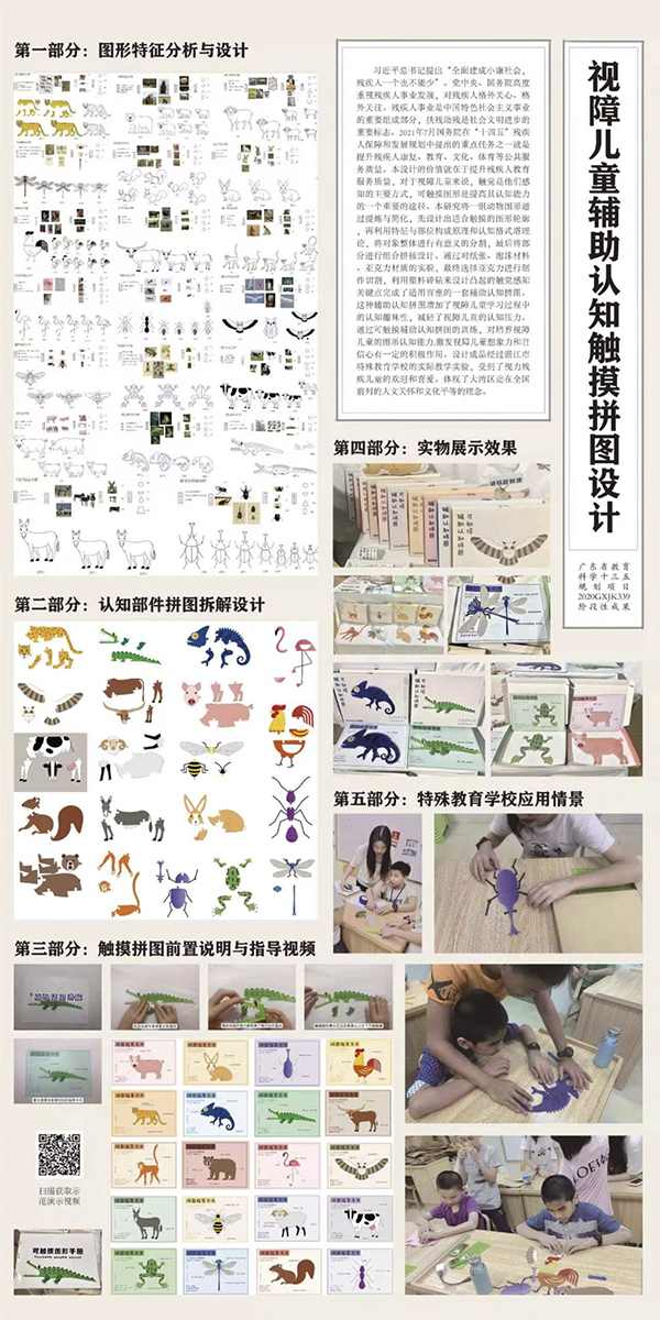 带领多感觉设计工作室(MSD Studio)团队成员共同完成的设计作品《视障儿童辅助认知触摸拼图设计》斩获教师类一等奖。