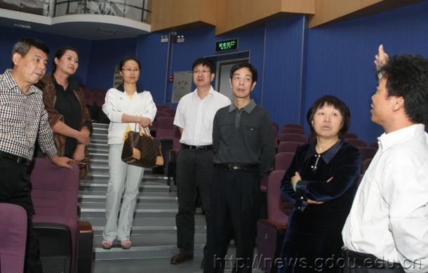 在小剧场,校领导一行认真听取威尼斯人娱乐城