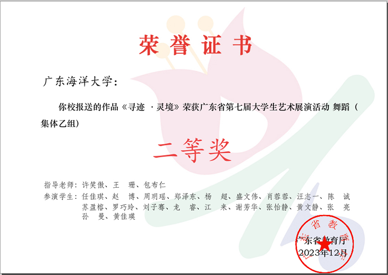王珊教授、包布仁副教授指导,青年博士许笑傲老师带领本科学生谢芳华、龙睿创作,舞蹈编导系20名同学参演的节目《寻迹·灵境》荣获广东省第七届大学生艺术展演活动(舞蹈集体乙组)二等奖。
