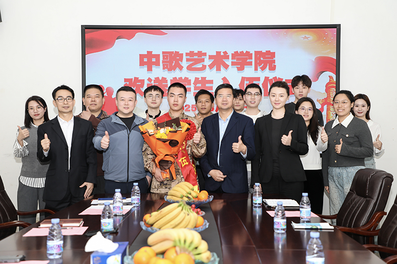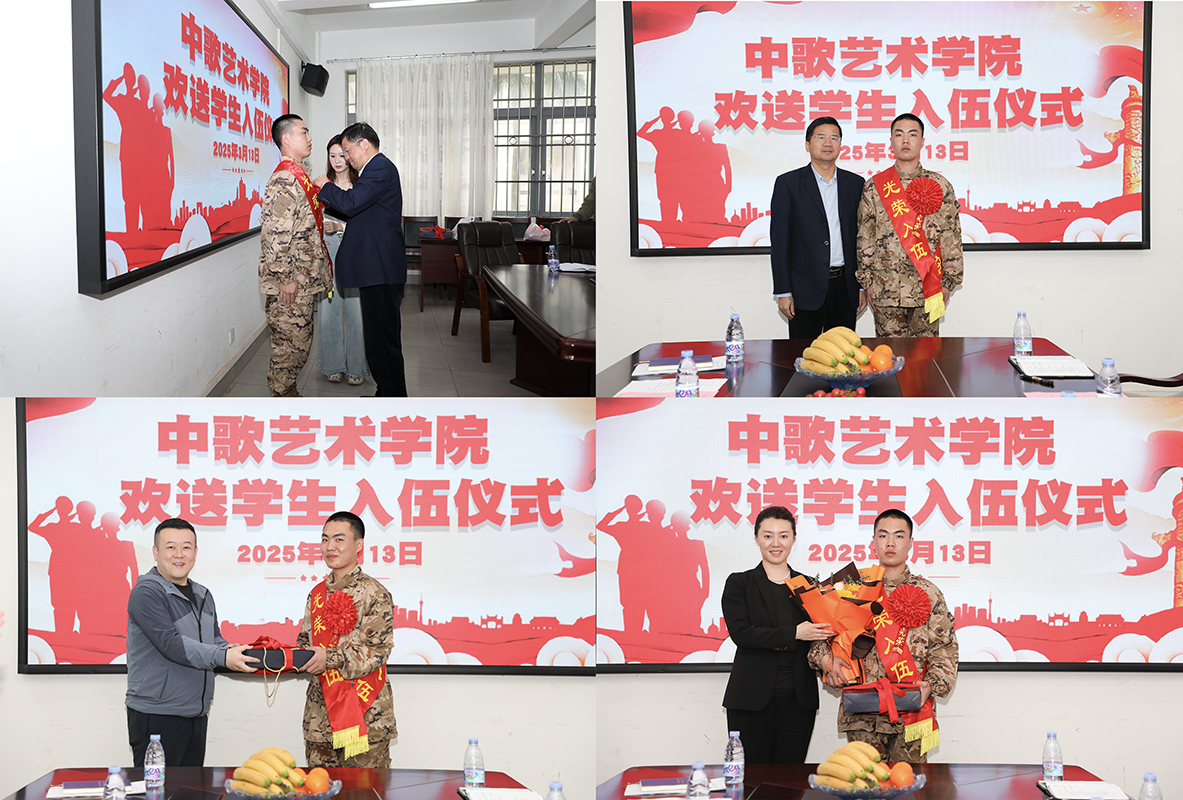 在艺海楼A208举行欢送学生入伍仪式,欢送民舞1222班尚印泉同学光荣入伍。威尼斯人娱乐城