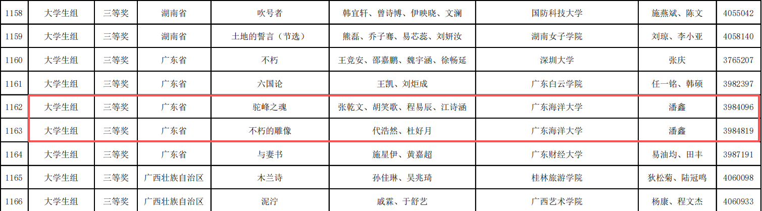 学子表现优异,由张乾文、程易辰、代浩然、胡笑歌共同演绎的作品《驼峰之魂》,与代浩然、杜好月合作的作品《不朽的雕像》双双脱颖而出,斩获全国大学生组三等奖。