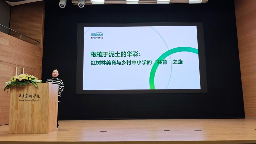 副教授、粤西艺海·麻章乡创高校艺术乡见工作室负责人金金作《根植于泥土的华彩:红树林美育与乡村中小学的“共育”之路》发言。她提出美育应扎根土地,以红树林生态为核心,构建“高校+地方”协同机制,打通艺术创作、生态教育、社区营造、学科教学四个维度,通过移动美育课堂、系统课程设计、社区墙绘共创等路径,实现乡村美育共育。